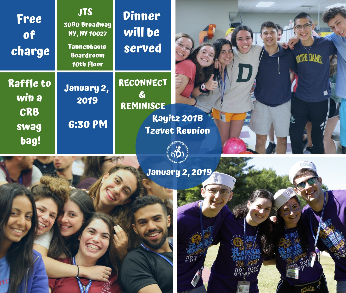 2018 CRB Tzevet (staff) are invited to join us on January 2nd to reconnect and reminisce with their CRB tzevet family! FREE OF CHARGE! Dinner will be served. Raffle to win CRB swag! *All raffle proceeds will be donated to the CRB Scholarship Fund.*
